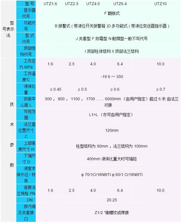 標記示例 :UTZ6.4F-BJ-----磁浮翻板式液位計工作壓力 6.4MPa ,高低位報警夾套型